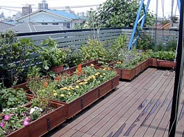 ![]() 屋上に敷いたデッキと常設プランター&キャスターを付けた可動式プランター |
